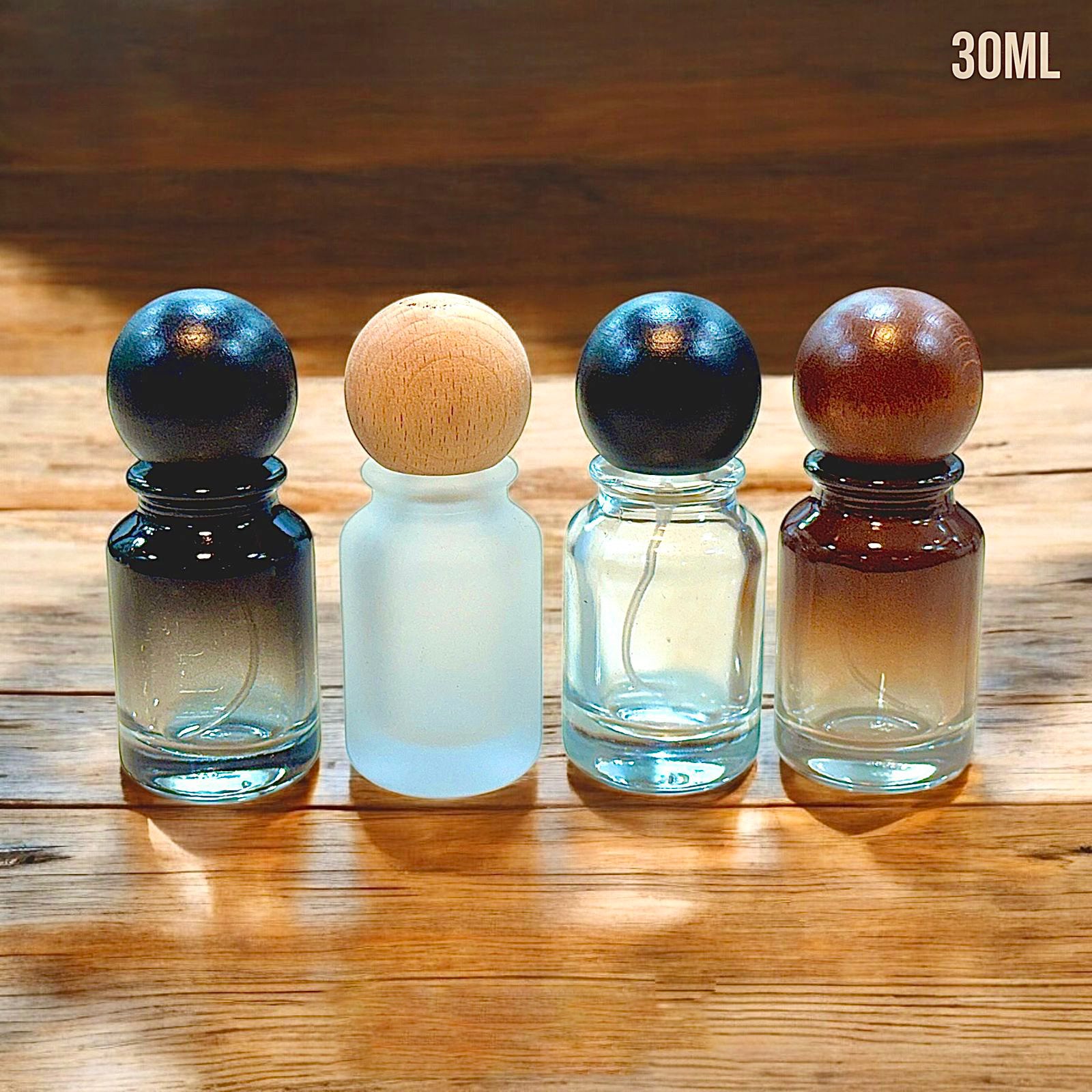 30ML Luxury Glass Empty Perfume Bottles with Aesthetic Spherical Wooden Caps (Set of 4) | PGB001