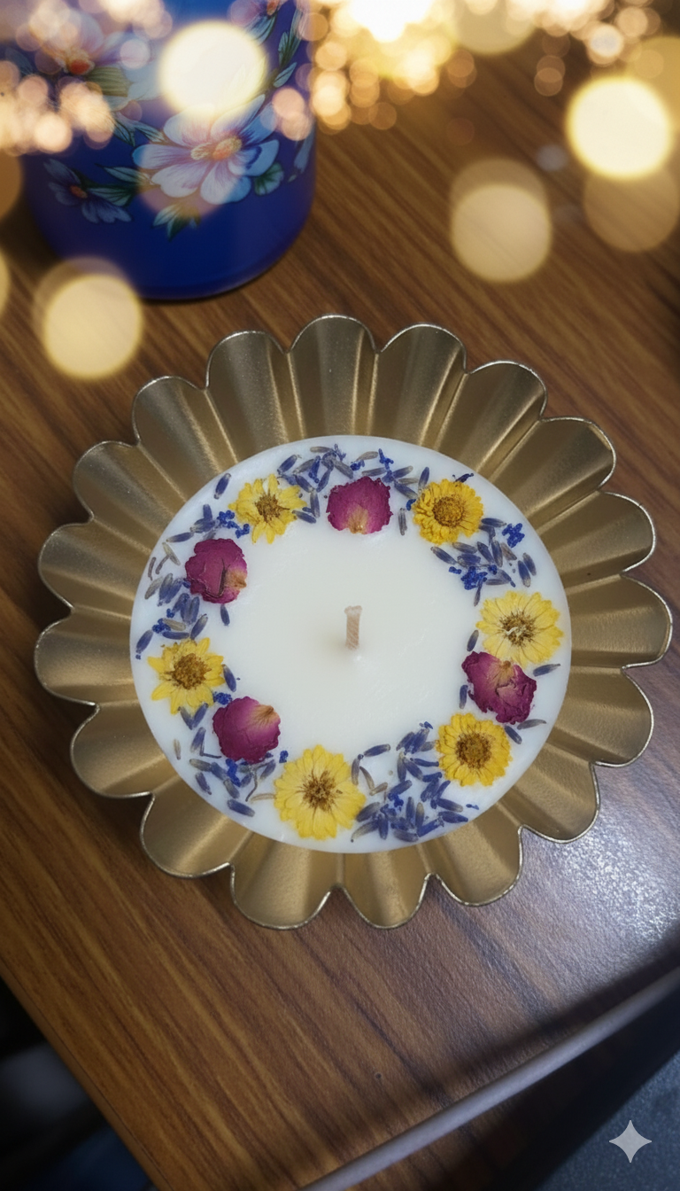 Bring home the glow of tradition with this exquisite Decorative Urli Candle. The shallow, wide-mouth bowl features a classic hammered texture and is filled with highly scented wax, beautifully adorned with festive decorations. This piece makes a magnificent addition to your Mandir, a dazzling centerpiece for your Diwali or T-light displays, or an elegant accent on your coffee table. It symbolizes prosperity and positivity, offering a delicate fragrance and a captivating, steady light that enhances any celebration. A unique and memorable gift for any auspicious occasion.